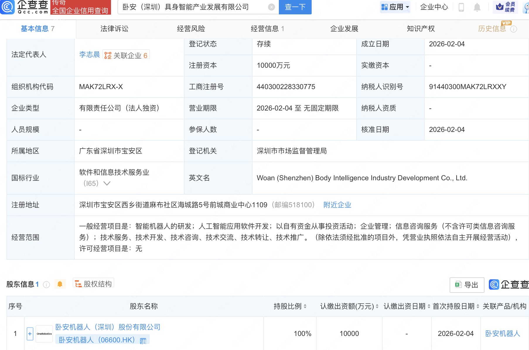 近日,卧安(深圳)具身智能产业发展有限公司成立,法定代表人为李志晨,注册资本1亿人民币,经营范围为智能机器人的研发,人工智能应用软件开发,以自有资金从事投资活动等。企查查股权穿透显示,该公司由卧安机器人(06600.HK)全资持股。